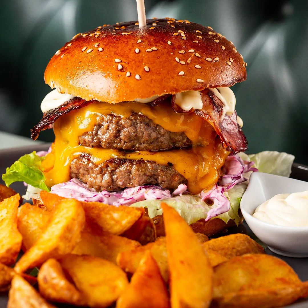 Pão de hambúrguer, dois hambúrgueres de bovino (150g), queijo cheddar, bacon, couve roxa, pickles de pepino, alface e maionese de alho e ervas
