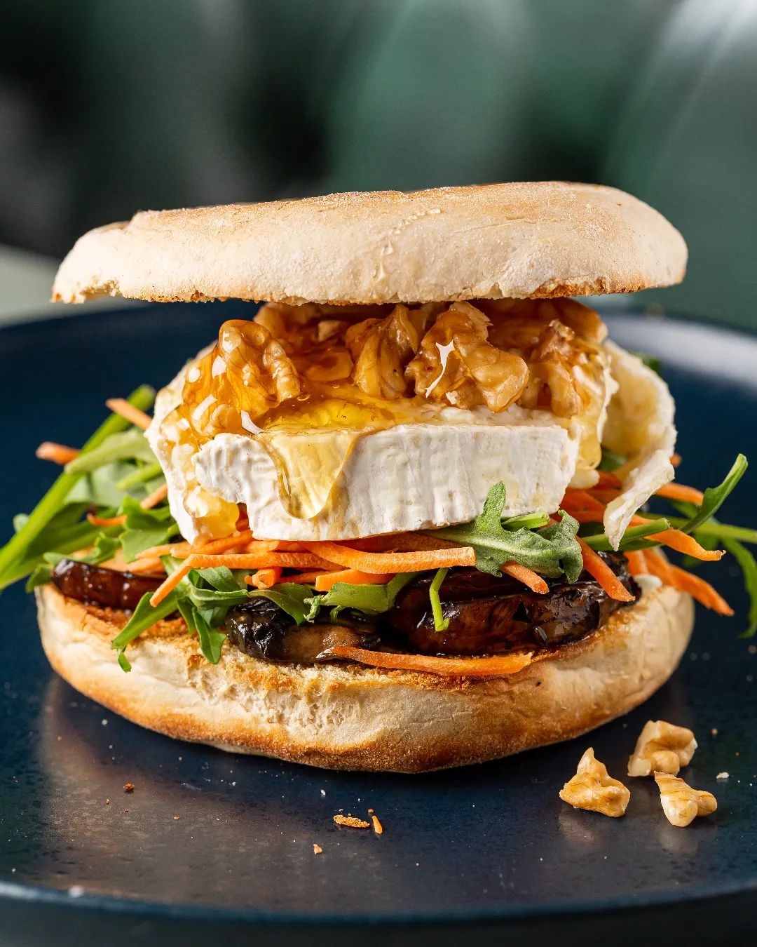 Bolo do caco, cogumelos portobello, queijo de cabra, rúcula, cenoura, nozes e mel